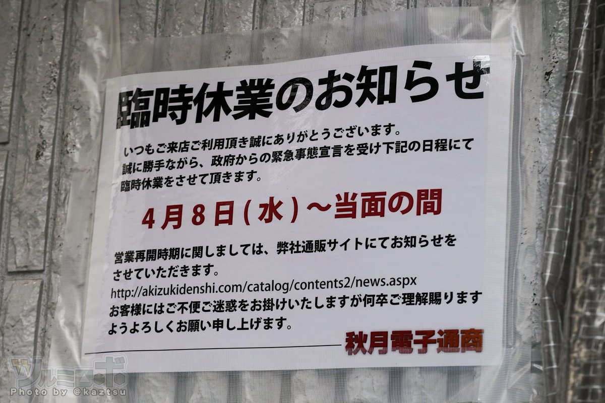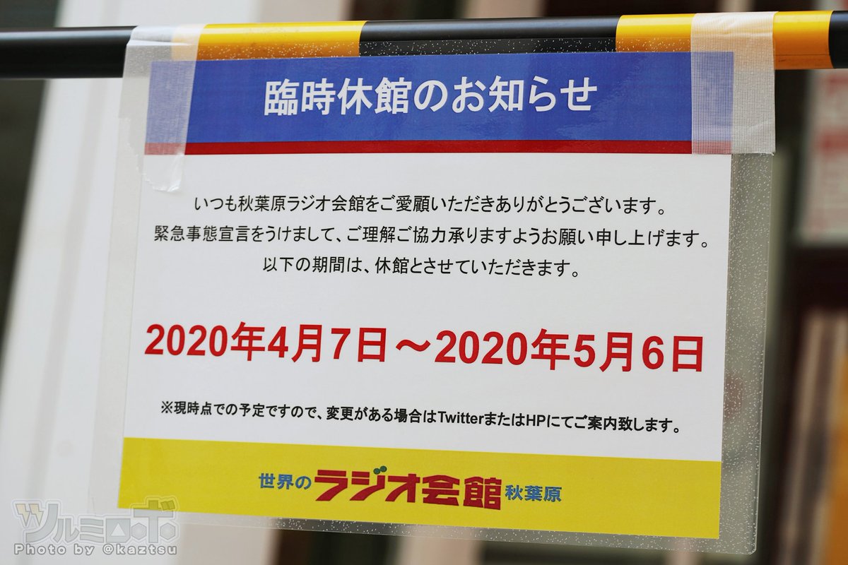 政府発令・緊急事態宣言後、秋葉原の臨時休業 ラジオ会館、セガ、タイトー、Hey、秋月、パチンコ店のアイランド、エスパスやバニーのお店なんかも休業だった pic.twitter.com/Np6HykzQqm