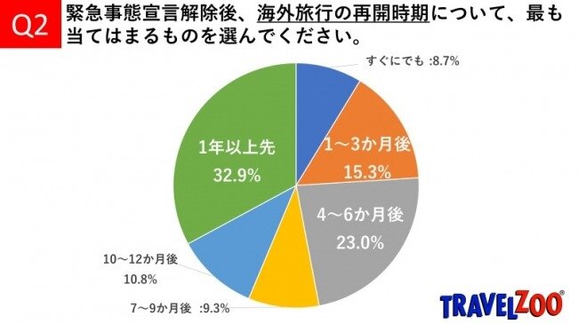 ・海外旅行の再開時期に関する質問では、「すぐにでも(8.7%)」「1~3か月後(15.3%)」「4~6か月後(23.0%)」を合わせて6ヶ月以内に旅行の再開意向を持つ回答者が47.0%に達する一方で、「1年以上先」が32.9%であることから、海外旅行の早期再開に対して慎重な意見も確認できたとしている。