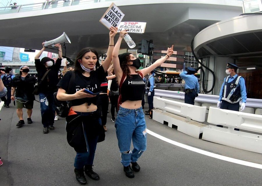 男性はすでに釈放されたが、これを受けて行われたのがこの日のデモ。アメリカ・ミネアポリス市での警官による黒人男性殺害事件に抗議する動きへの連帯も表明し、当日は多くの外国人と思しき人々も参加した。