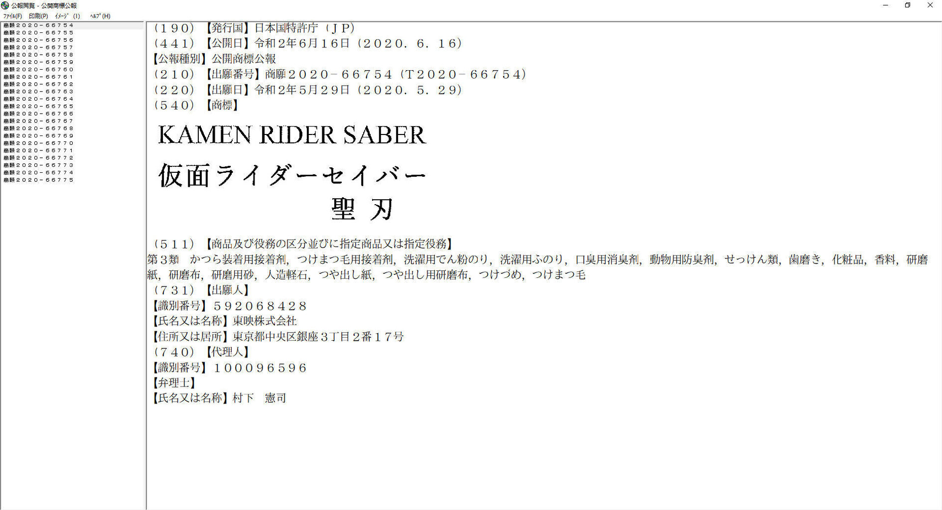東映株式会社により「KAMEN RIDER SABER / 仮面ライダーセイバー/聖刃」が商標登録出願されていることが、公開商標公報から明らかになりました。出願番号は2020-66754~2020-66775です。 pic.twitter.com/lsG586Nlzz