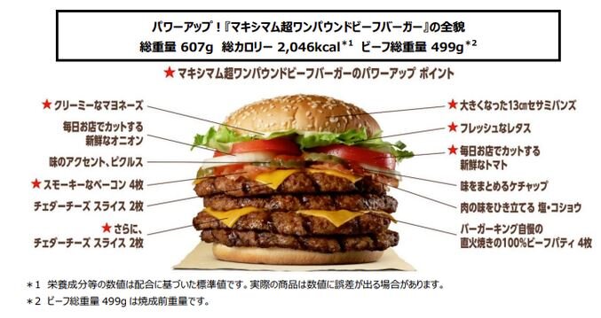 あの超ワンパウンドがさらにパワーアップ!マキシマム超ワンパウンドビーフバーガー!さらに大きく、直火焼きの100%ビーフのうまさ引き立つパーフェクトバランスで新登場!挑戦者の証、オリジナルステッカー付き!