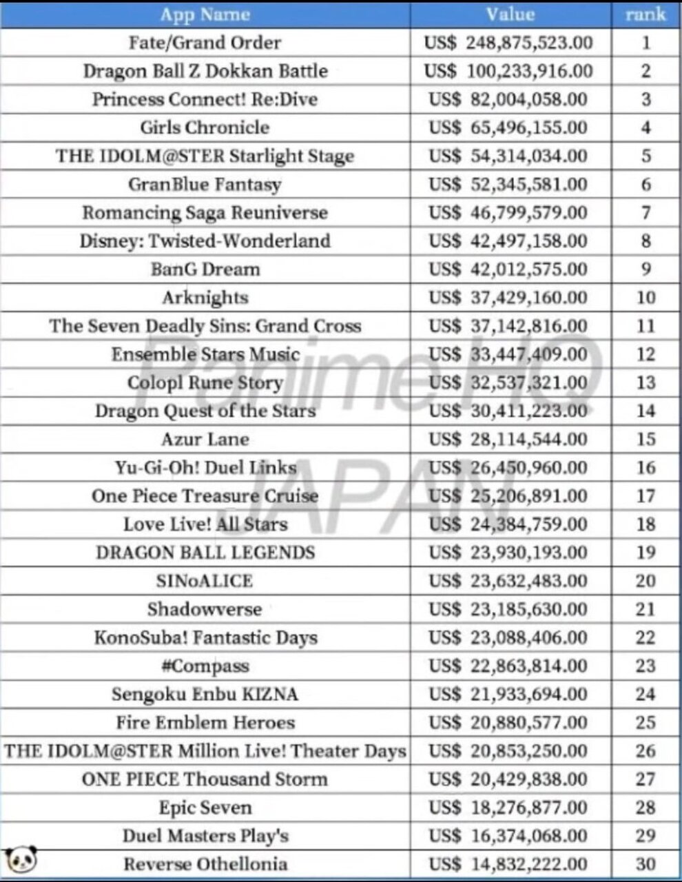 ■(Japan) Half-Year 2020 Anime Gacha Mobile Game Revenue Tier List