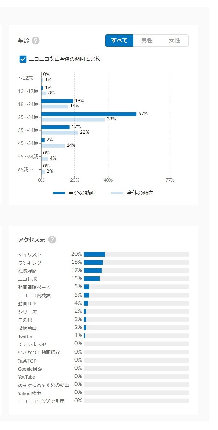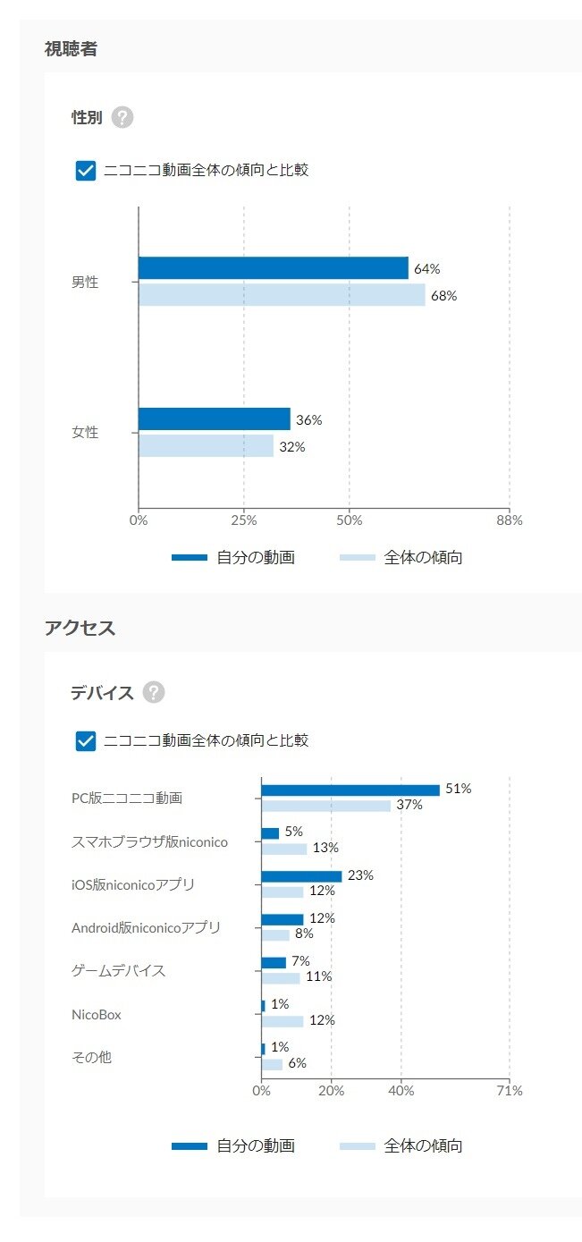 最近実装されたニコニコのアナリティクス機能、自分の動画視聴者層を全体と比較できるのは凄く面白いですね。