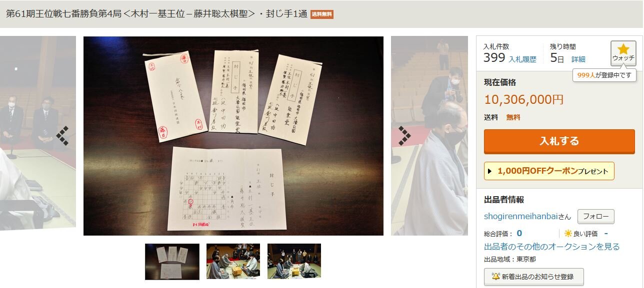 ・7~8月に藤井聡太棋聖(18)と木村一基王位(47)=肩書はいずれも当時=が対戦した将棋の王位戦7番勝負第2~4局で使用した「封じ手用紙」3通分のチャリティーオークションが14日に始まり、同日午後7時30分には最高入札額がいずれも1000万円を超える大盛況となった。