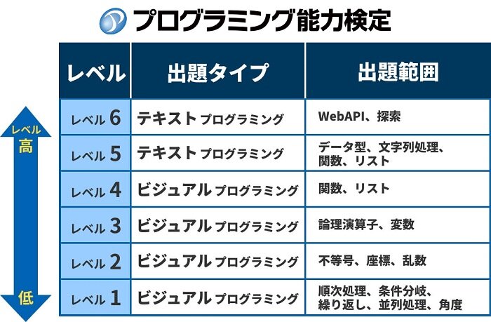 ・「プログラミング能力検定」は小学生・中学生・高校生を対象に、プログラミングの基礎となる知識を測るための6段階のレベルからなる試験。順次処理、条件分岐、繰り返し、変数など、プログラミングの概念の理解度を体系的に分析・評価することで受検者のプログラミング能力を詳細に測り、それまでの学習成果を証明すると共にその後の効果的な学習に繋げることができる。