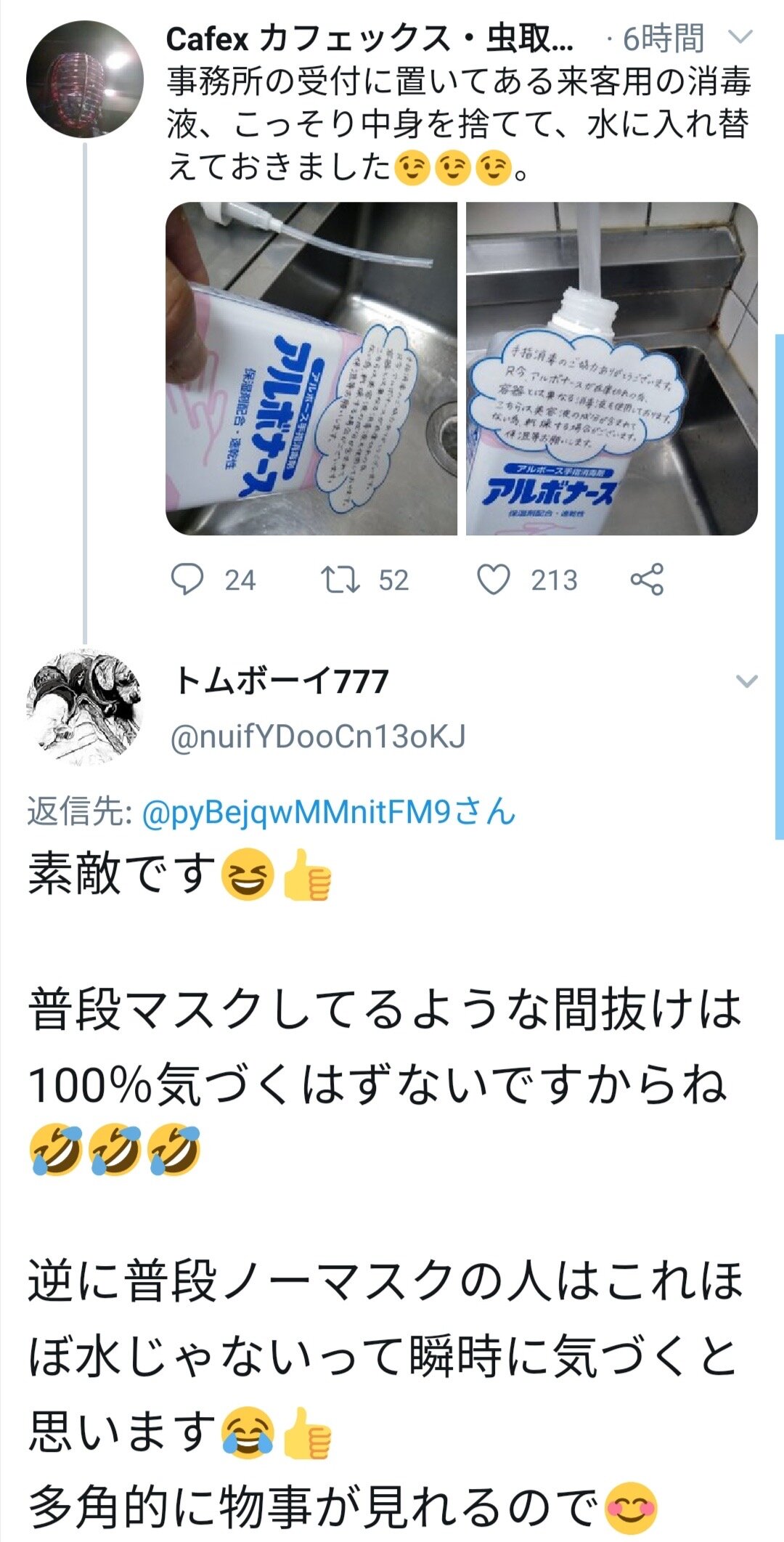 ・アルコール消毒液頭からぶっかけてあげたい😆