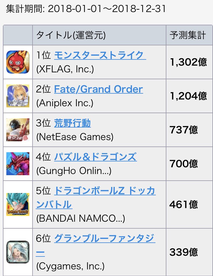 あれってAppAnnieの調査で金額も出してない奴やろ?ゲームに特化してるSuperDataの調査だとFGOは世界売上1300億円くらいで7位やったで
