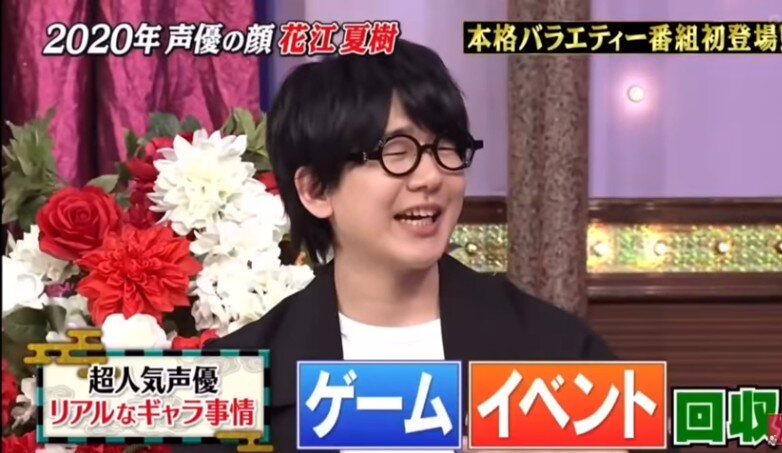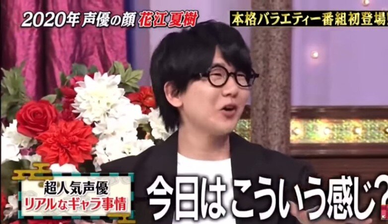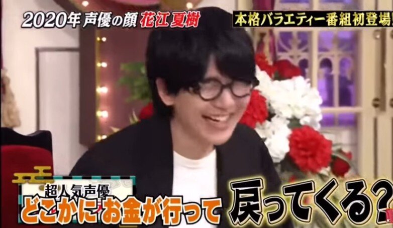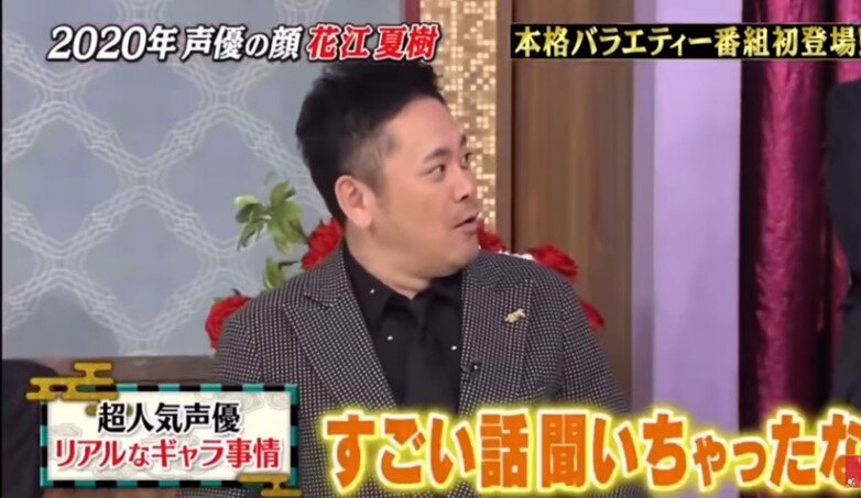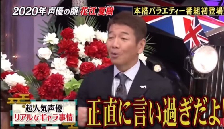 ・2011年に声優デビューし、今年の声優界の顔となった花江。ネプチューン・堀内健から「どういう契約なの?パーセンテージ?」などとギャラについて直球で聞かれると、花江は「○○」と笑顔で返答。放送上はピー音で隠されたが、進行役のくりぃむしちゅー・上田晋也は「アンタもハッキリ言ったね!」「そういうもんなの?!」、有田哲平も「え~っ?!どういうこと?!」と驚いた。