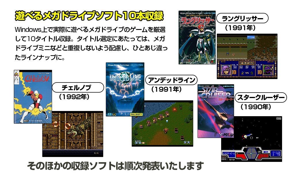 ・Windows上で実際に遊べるメガドライブのゲームを厳選して10タイトル収録。「チェルノブ」「ラングリッサー」「アンデッドライン」「スタークルーザー」などが収録予定だ。「SEGA HISTORY COLLECTION メガドライブ編」フルセットも同梱される。
