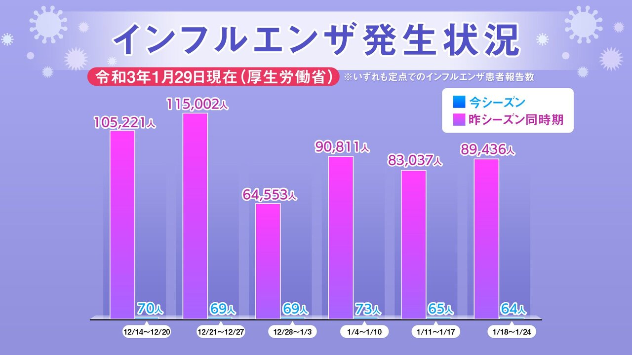 ・これは新型コロナウイルスの感染予防対策が功を奏してインフルエンザの感染予防の手助けにもなっているってことなんだろうか?ただ裏を返すとコロナの感染力の高さを改めて実感するな…