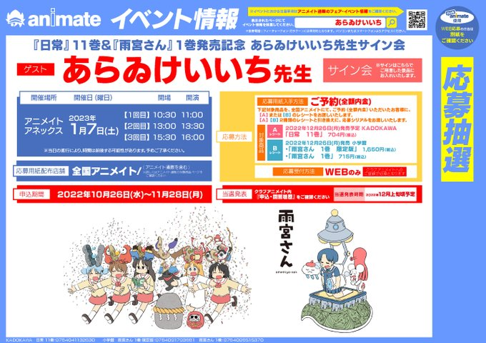 『「日常」11巻&「雨宮さん」1巻発売記念 あらゐけいいち先生サイン会』開催決定ヒラ!!