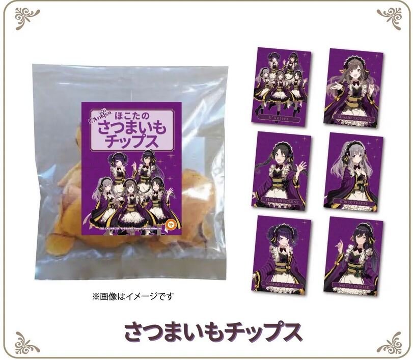 鉾田市産のさつまいもを使用したさつまいもチップスや、アンティーカの描き下ろしイラストを使用した缶バッチ、アクスタなどを販売。鉾田市内には等身大パネルも設置#シャイニーカラーズ