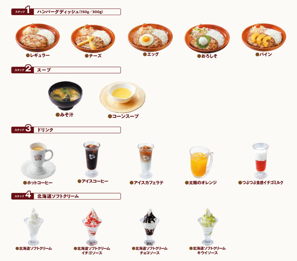 ハンバーグディッシュは5種、スープは2種、ドリンクは5種、デザートは4種の中から1つずつ、好みの商品を選べる。