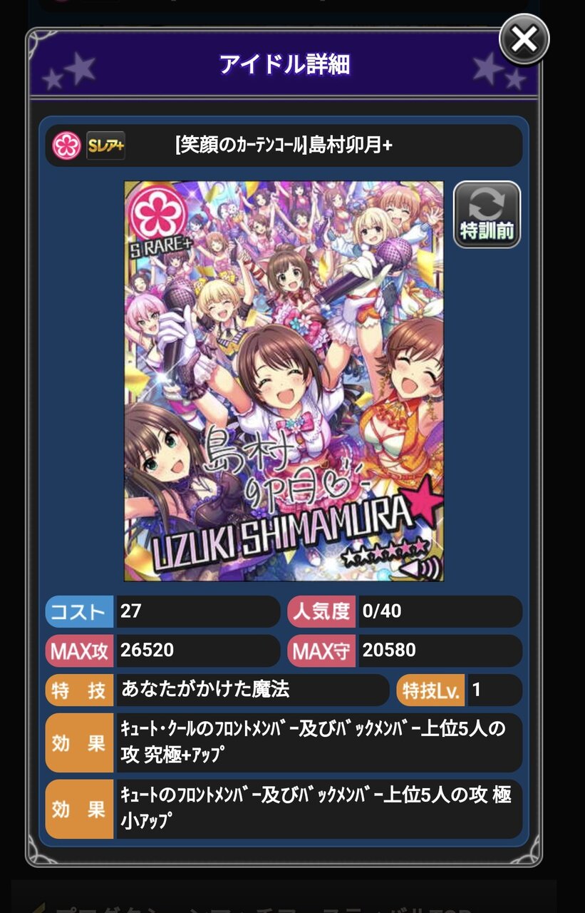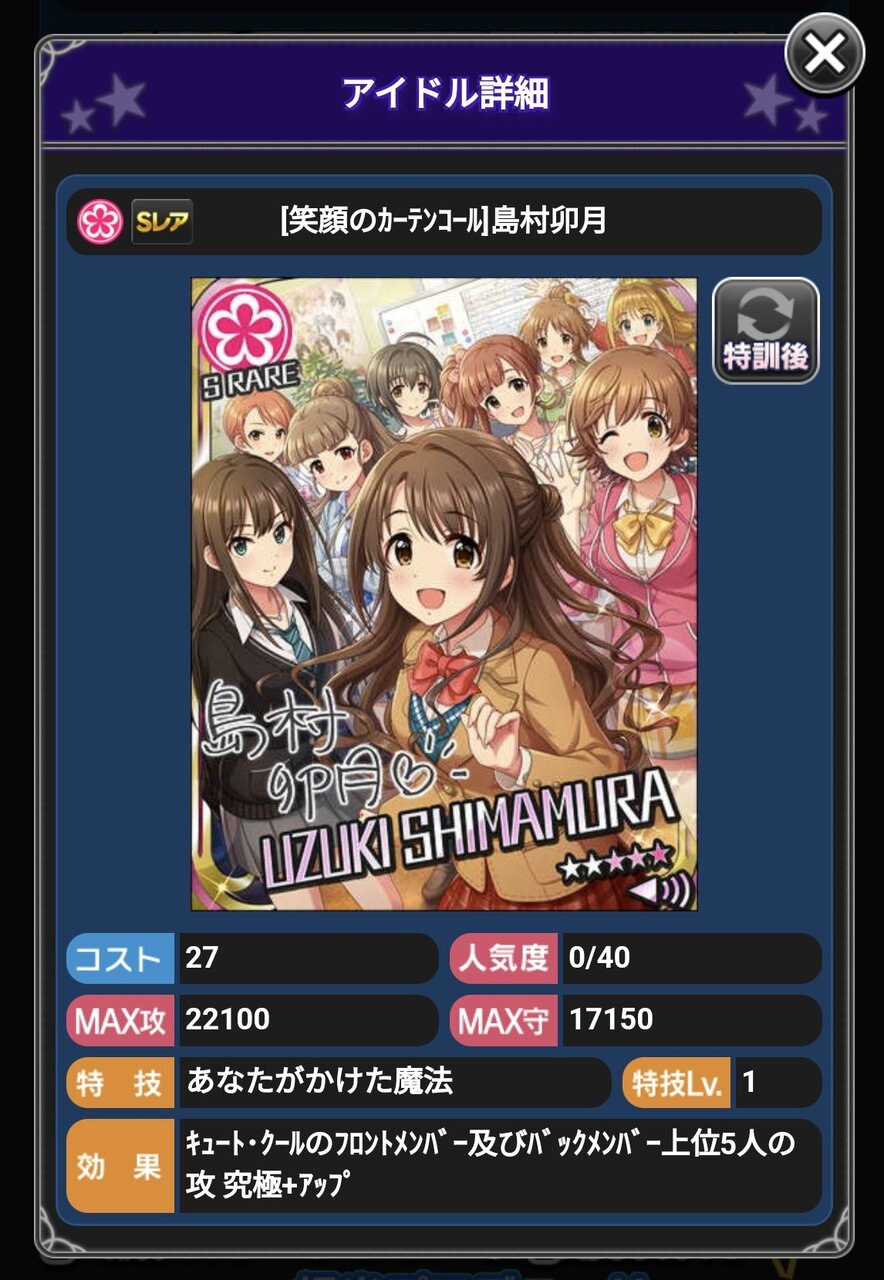 モバマスの最後のカードは[笑顔のカーテンコール]島村卯月かー。