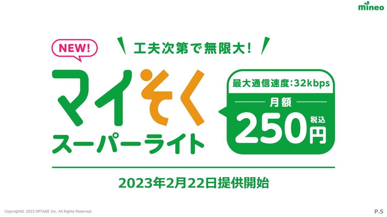 ・オプテージは、MVNOサービス「mineo」において新料金プラン「マイそく スーパーライト」を2月22日から提供する。月額利用料金は250円。
