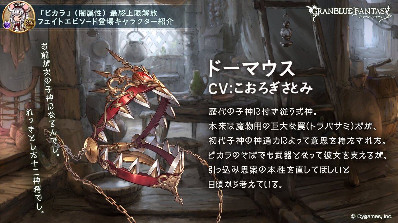 ビカラの武器として活躍するトラバサミ、ドーマウス。言葉を持たぬ子神の式神と思いきや、実は喋ることができたのだ。歴代の子神を支えてきたドーマウスは、ビカラを次の子神として目覚めさせようとするが……? #グラブル pic.twitter.com/wzdgzmKzyZ