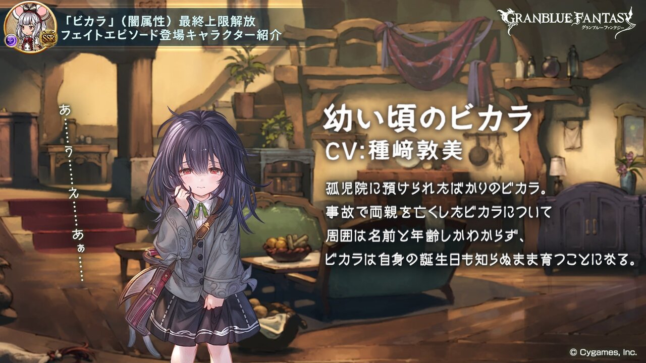 事故で両親を亡くしたばかりの幼いビカラ。たまに髪が白くなるという不思議な特徴が原因で他の島の孤児院に断られてしまい、島内のハーヴィン専用の孤児院で育てられることになるのだが── #グラブル pic.twitter.com/wwOckp2x8B
