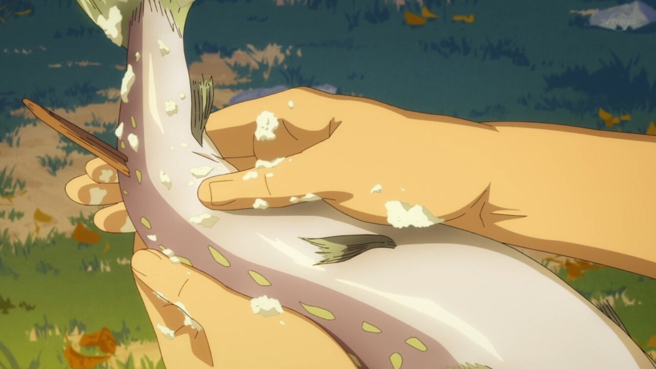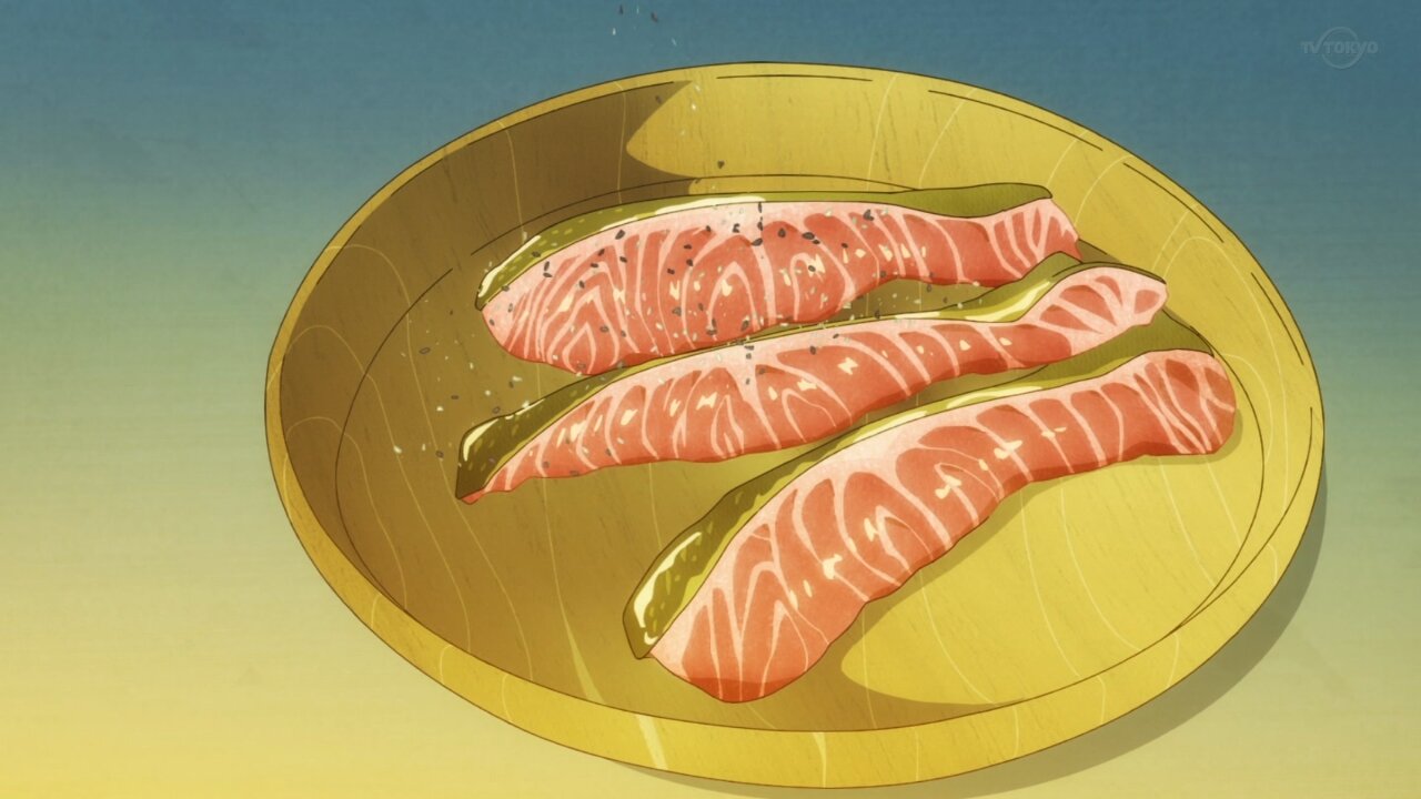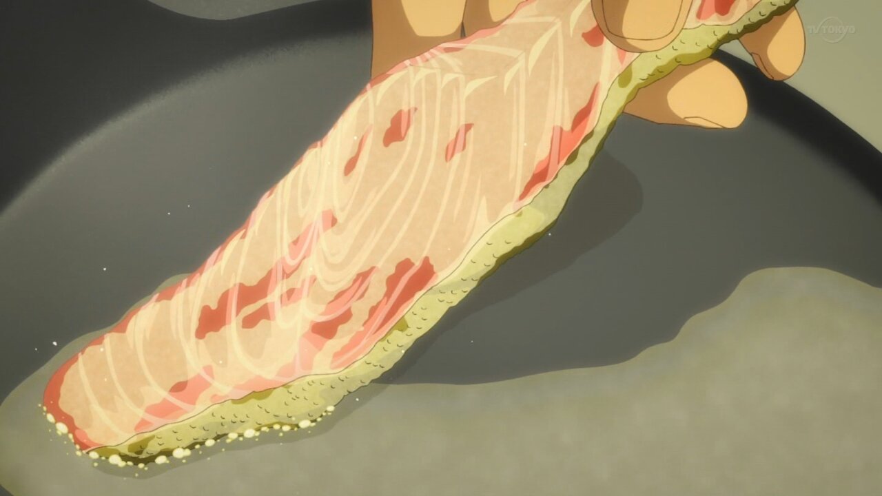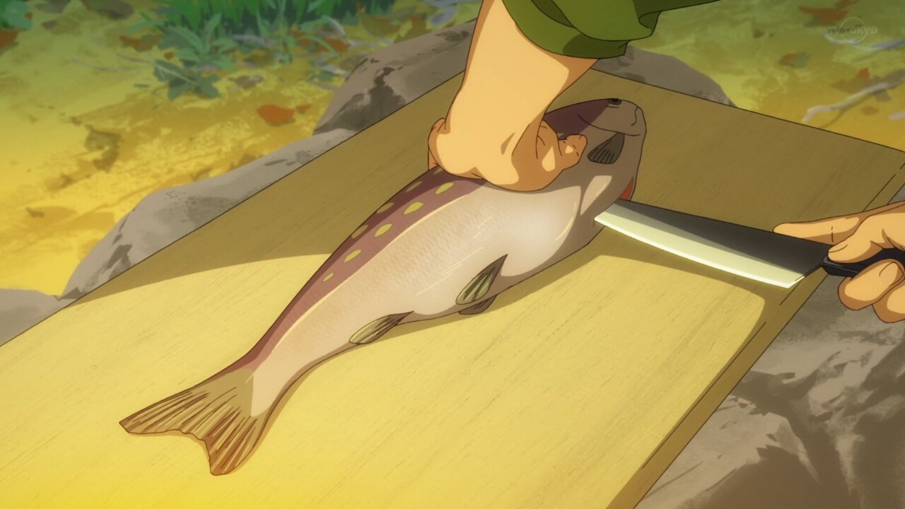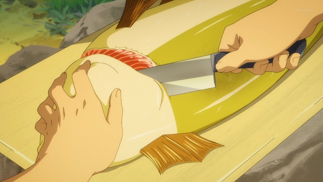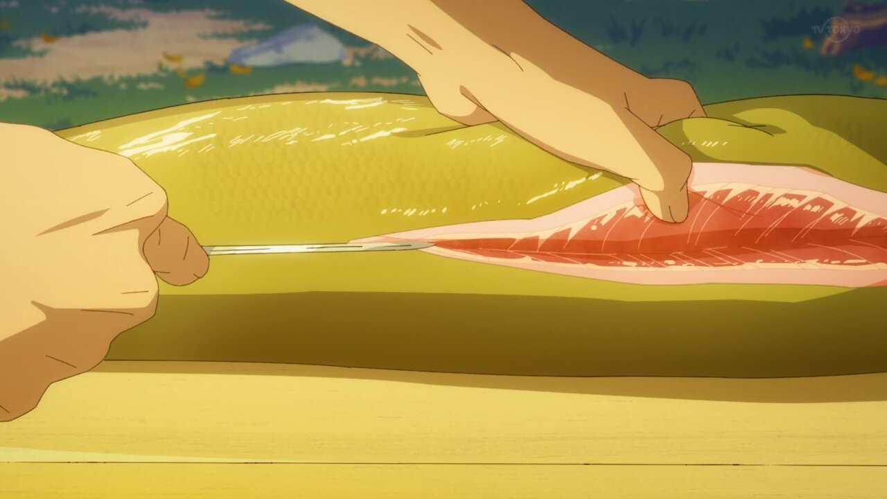 鱗はセリフで処理してたし、その場で捌いて食うんだから血抜きは要らないし、家庭料理のレベルであの程度の切り身で魚の骨なんていちいち抜くか?