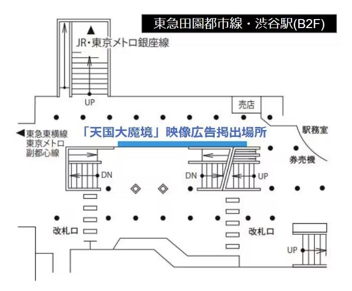 東京・東急田園都市線渋谷駅の地下通路内でアニメ「天国大魔境」映像が掲出される位置。[拡大]
