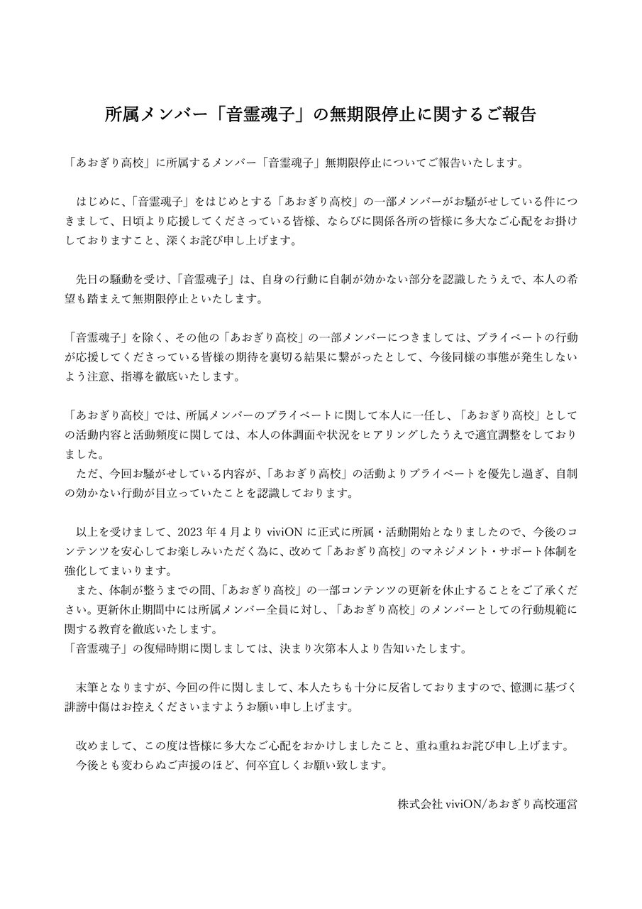 はじめに、「音霊魂子」 をはじめとする 「あおぎり高校」の一部メンバーがお騒がせしている件につ きまして、日頃より応援してくださっている皆様、ならびに関係各所の皆様に多大なご心配をお掛け しておりますこと、深くお詫び申し上げます。