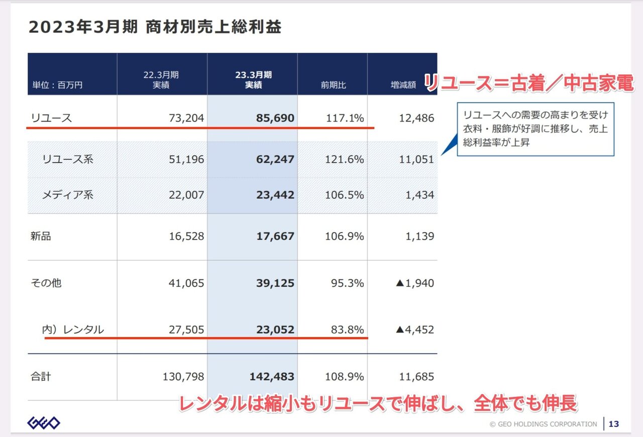 ・循環型社会の形成やインフレへの生活防衛手段としてのリユース需要の高まりに加えて、国内外の「2nd STREET」及び「GEO」「GEO mobile」の積極的な出店などがトップラインを牽引する見通し。また、販売管理費の適切なコントロールなどの取り組みも寄与する。