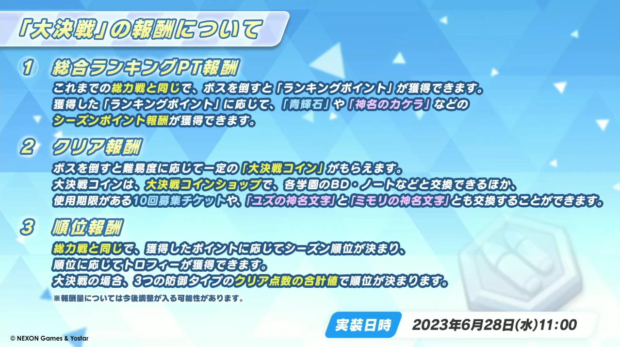 詳細内容、および予定実装時間についてはこちらの画像にてご確認くださいね。#ブルアカ#ブルアカらいぶ初夏SP pic.twitter.com/eDStA3vd56