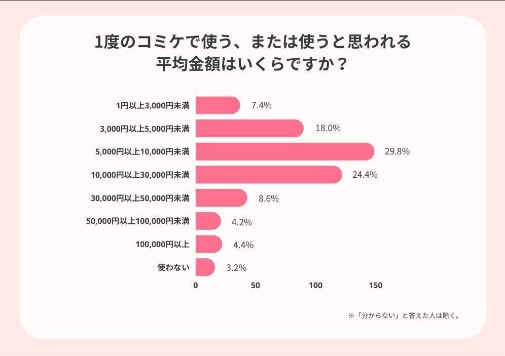 ・コミケに行く人たちは1度のイベントでいくらぐらいお金を使うのだろうか。「1度のコミケで使う平均金額はいくらですか?」という質問を行ったところ、最も多かったのは「5,000円以上1万円未満」の回答だった。また、1度のコミケで1万円以上使う(または使うと思われる)人の割合は4割を超えており、非常に経済効果の大きなイベントであることが伺えた。