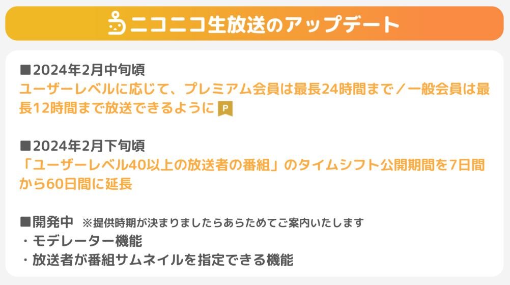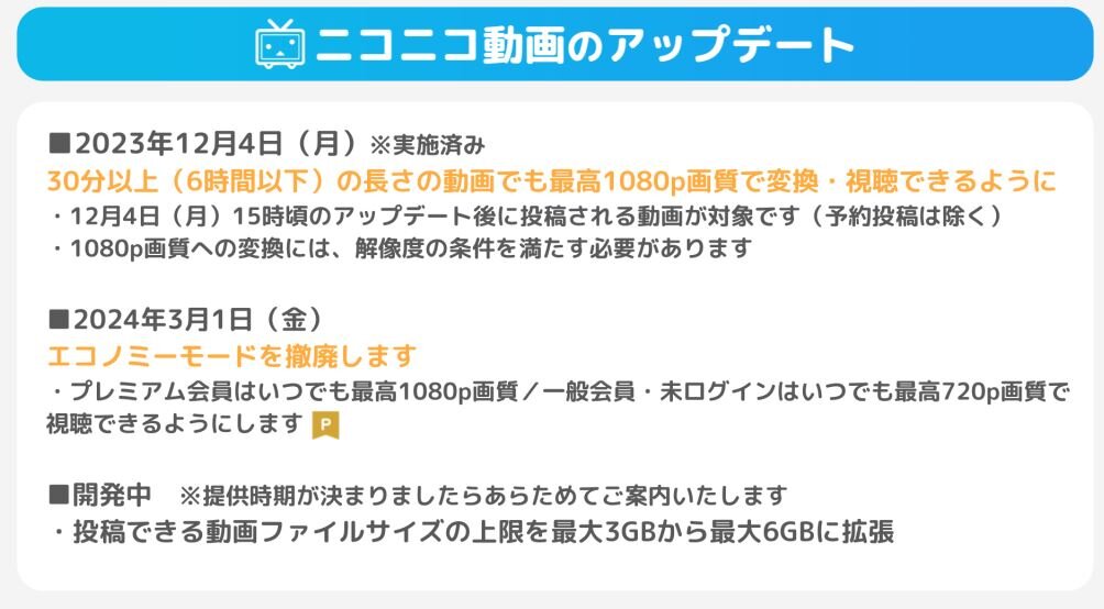 ニコニコ動画/生放送で、2023年12月から2024年3月にかけて複数のアップデートを実施します。