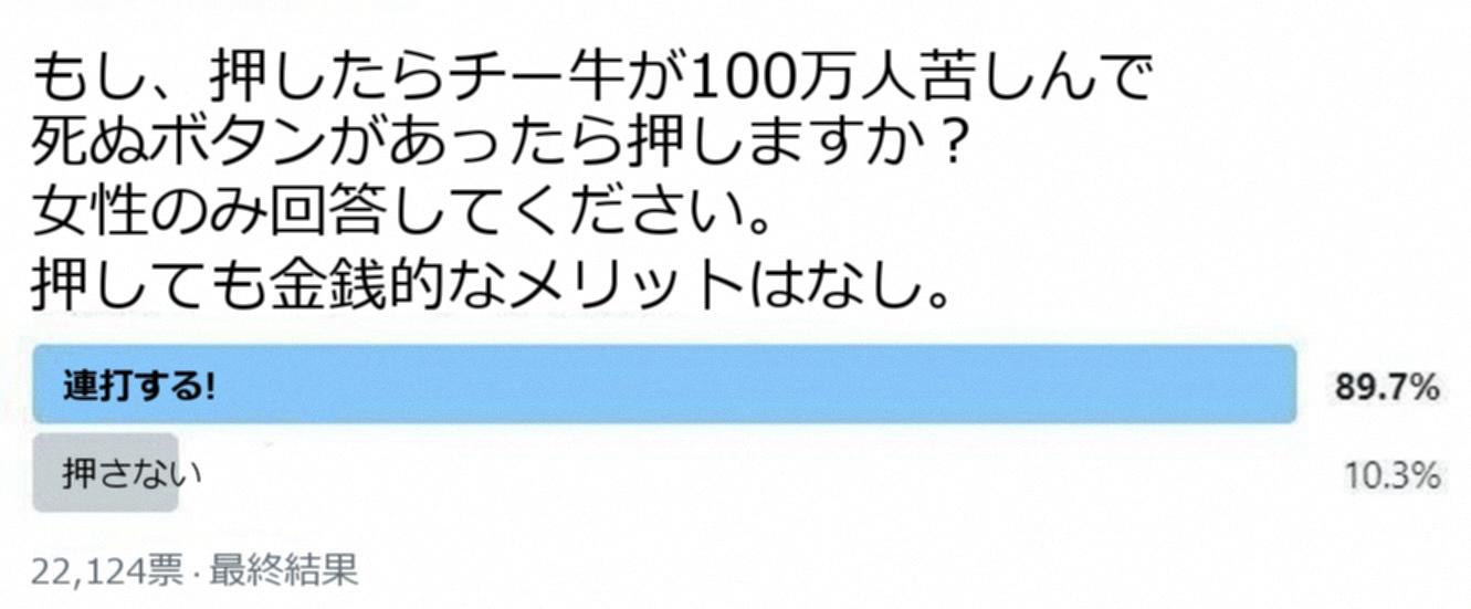 もし押したらチー牛が100万人苦しんで死ぬボタンがあったら押しますか?