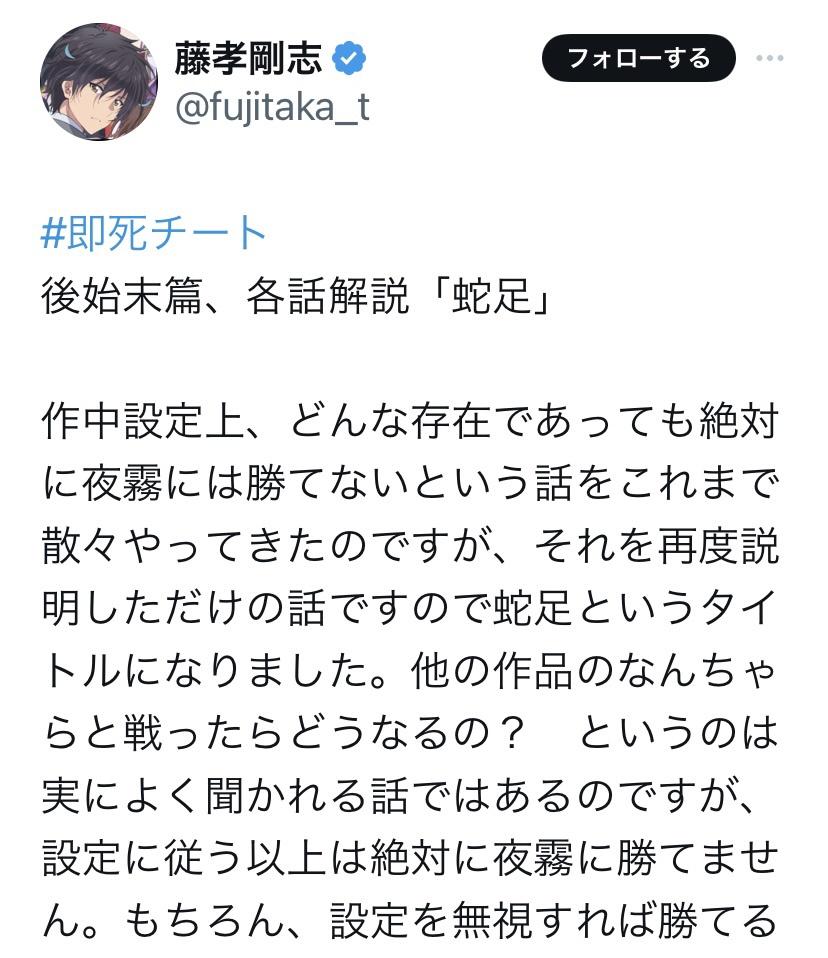 即死チート作者の感じ方や捉え方が優先される宇宙の主人公は即死チート作者なので「設定に従えば夜霧に勝てません」と思えばその通りになる。 しかし、他人の宇宙の主人公が「設定に従えば夜霧に勝てません」というtweetをどう解釈するかは、貴方の宇宙の主人公である貴方が好きに捉えればいいってのはどう?www