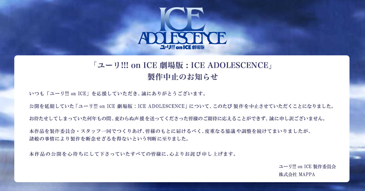 公開を延期していた「ユーリ!!! on ICE 劇場版:ICE ADOLESCENCE」 について、このたび製作を中止させていただくことになりました。