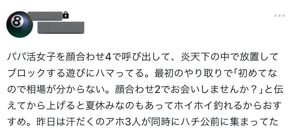パパ活女子を顔合わせ4で呼び出して、炎天下の中で放置してブロックする遊びにハマってる。