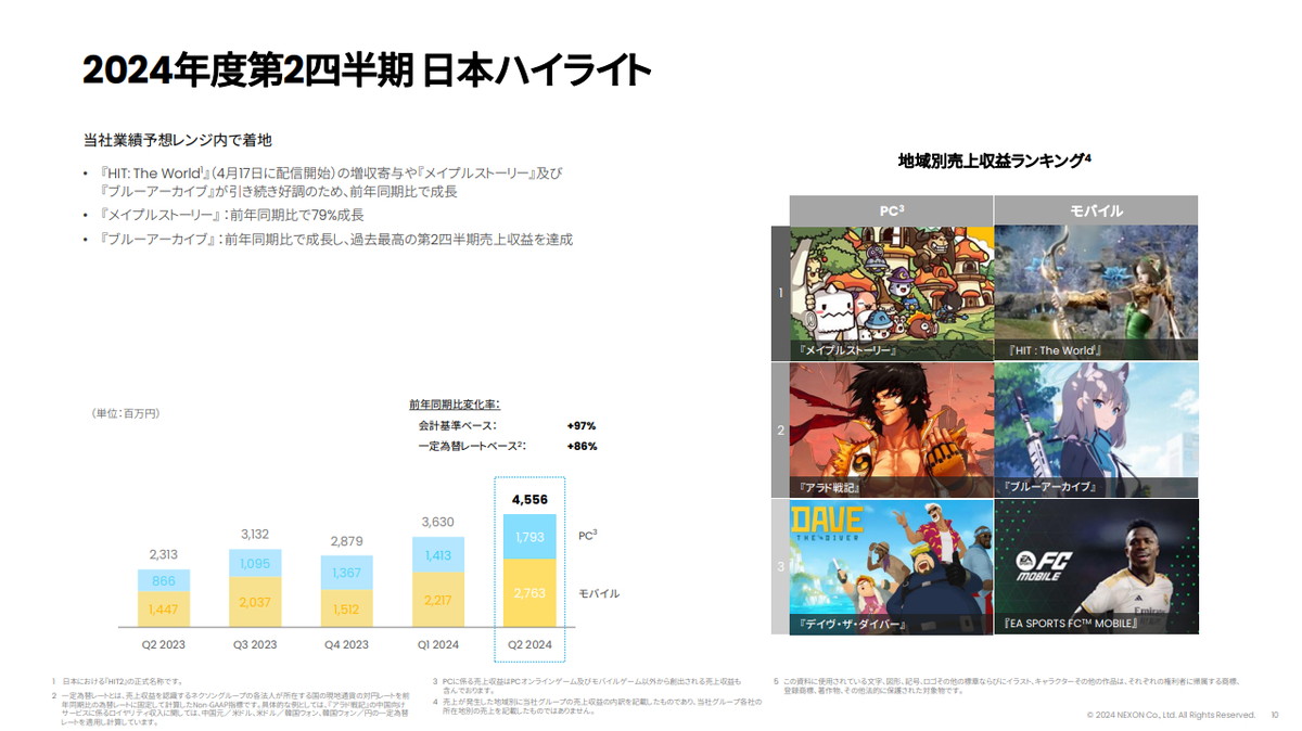 ネクソンは、第2四半期(2024年4~6月)の決算説明資料で、『ブルーアーカイブ』の業績動向について、日本国内では前年同期比で成長し、過去最高の第2四半期売上収益を達成したことを明らかにした。