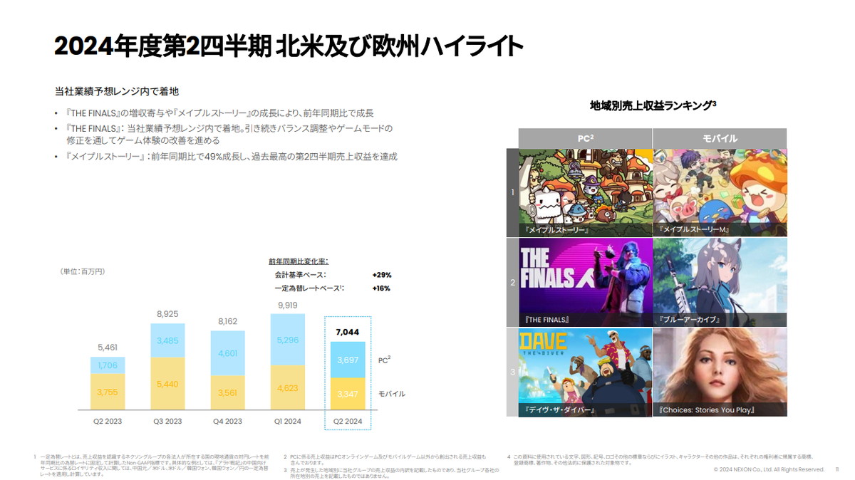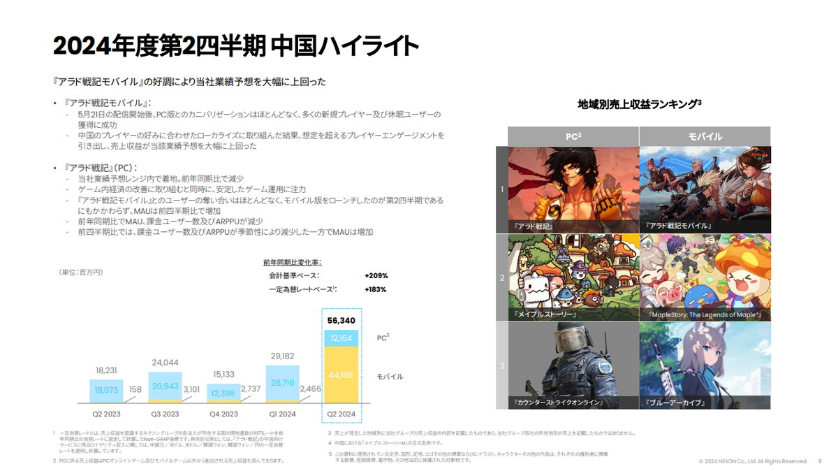 北米と欧州でも前年同期比で49%成長し、過去最高の第2四半期売上収益を達成したとのこと。中国でも『アラド戦記モバイル』『MapleStory: The Legends of Maple』に次ぐ収益規模だった。