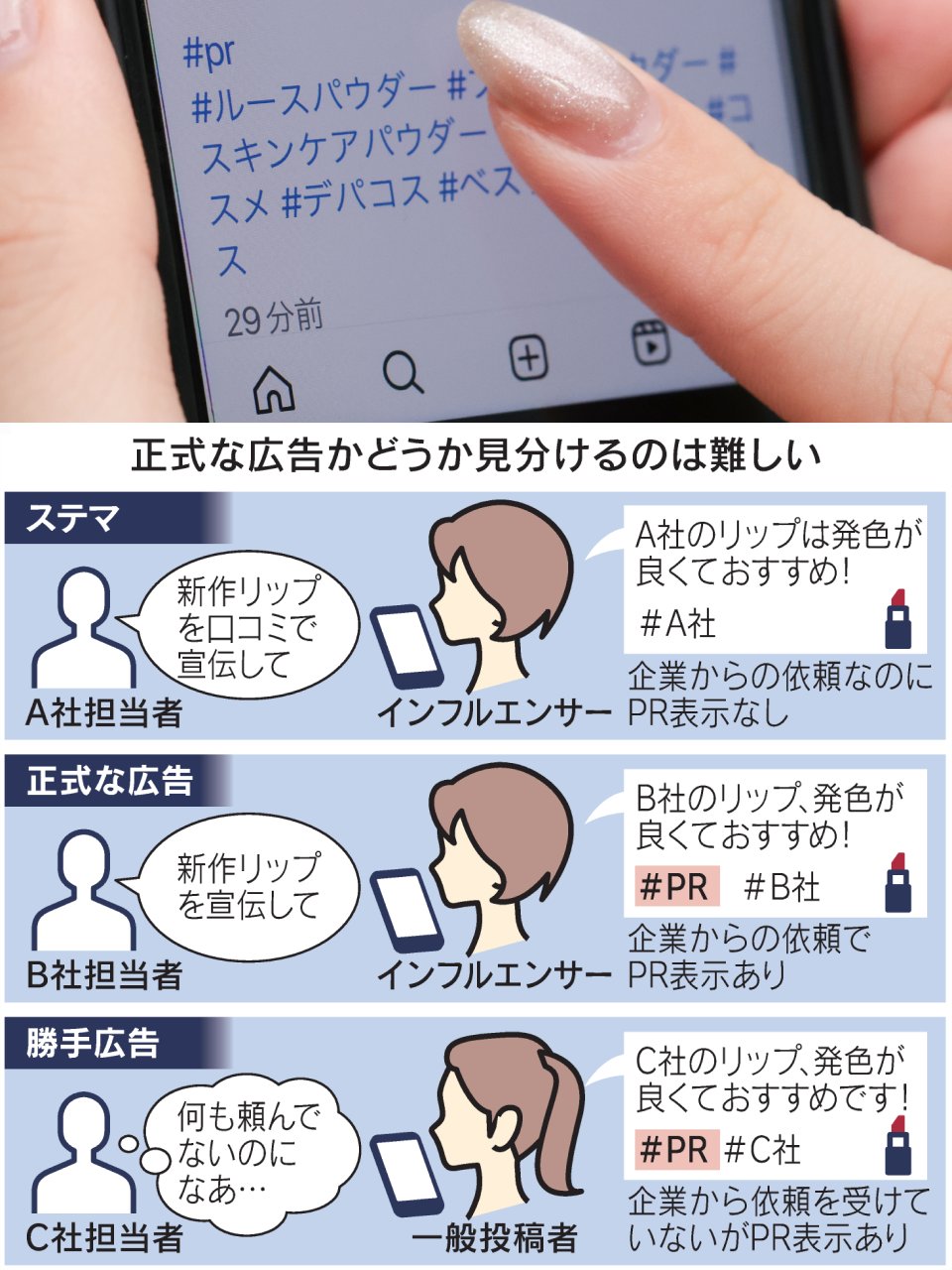 企業が依頼した広告でないのに、個人が「PR」などと表示する例が急増。現状のステマ規制が想定していない事態で、「お墨付きのような印象を与えかねない」との懸念も。