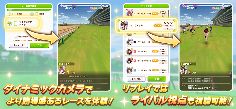 対象レースのレース開始時とリプレイ再生時に、「縦画面」「横画面」に加えて、「ダイナミックカメラ」を選択できます。