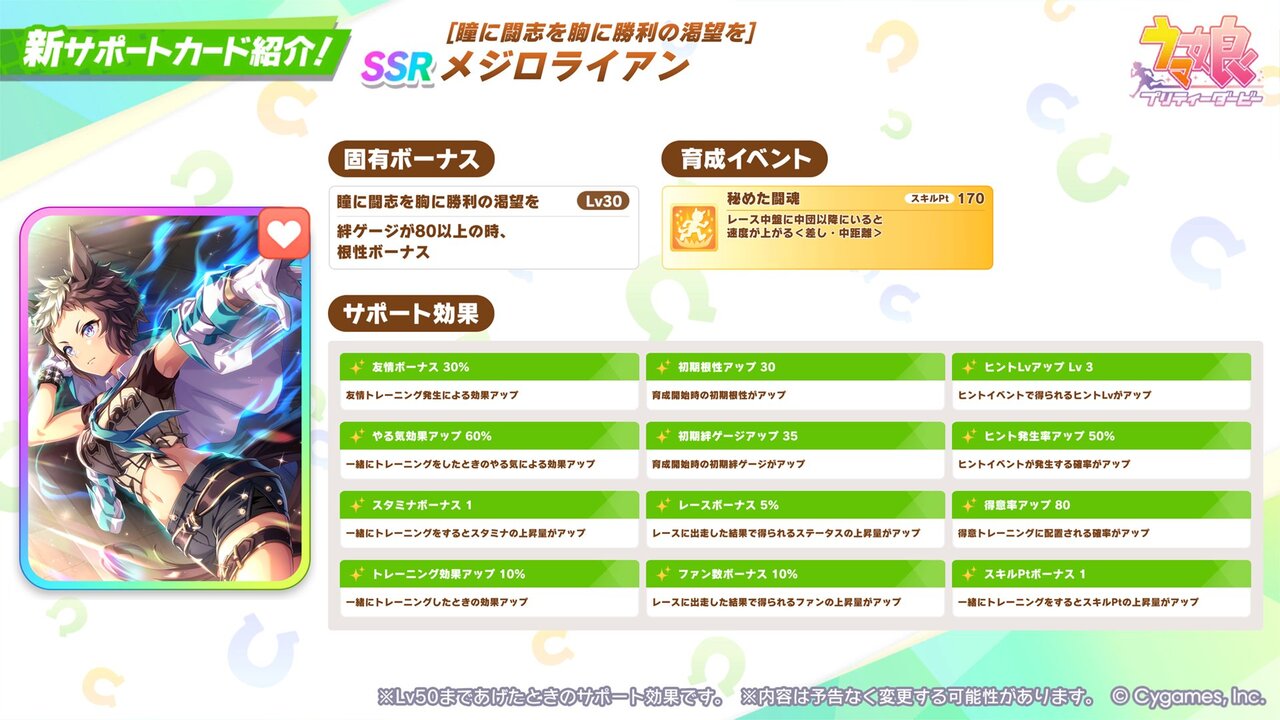 新たに登場するSSR[瞳に闘志を胸に勝利の渇望を]メジロライアンの情報を一部ご紹介!