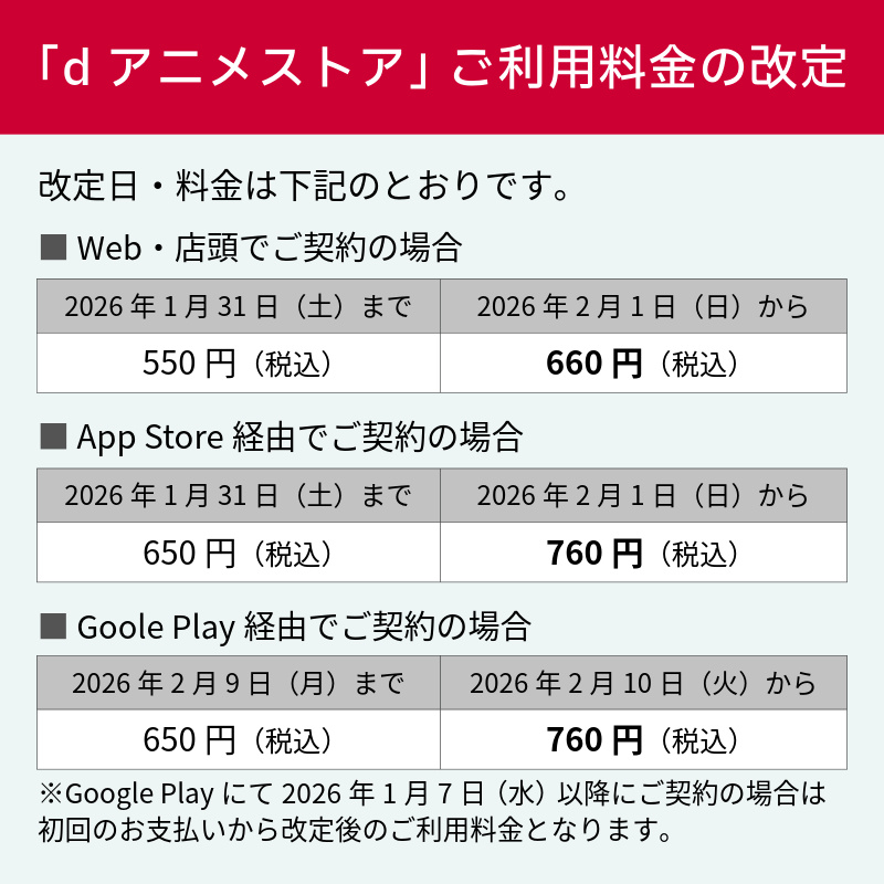 「dアニメストア」は、2026年2月以降、サービスの向上をめざし、現在ご利用中のお客さまも含めて次のとおり月額料金を改定いたします。