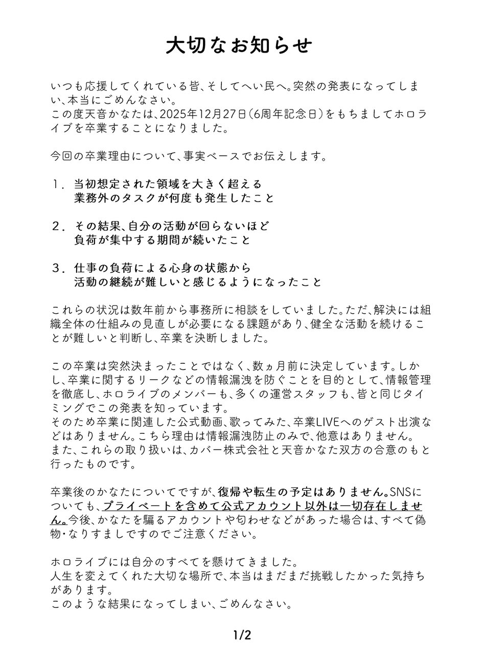 【天音かなた卒業に関するお知らせ】 pic.twitter.com/0RVLHZFWSG