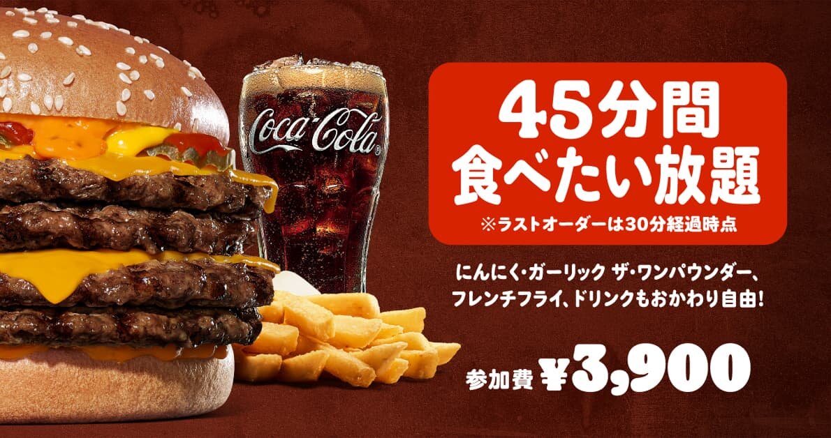 4枚肉の超大型バーガー『にんにく・ガーリック ザ・ワンパウンダー』が食べたい放題!