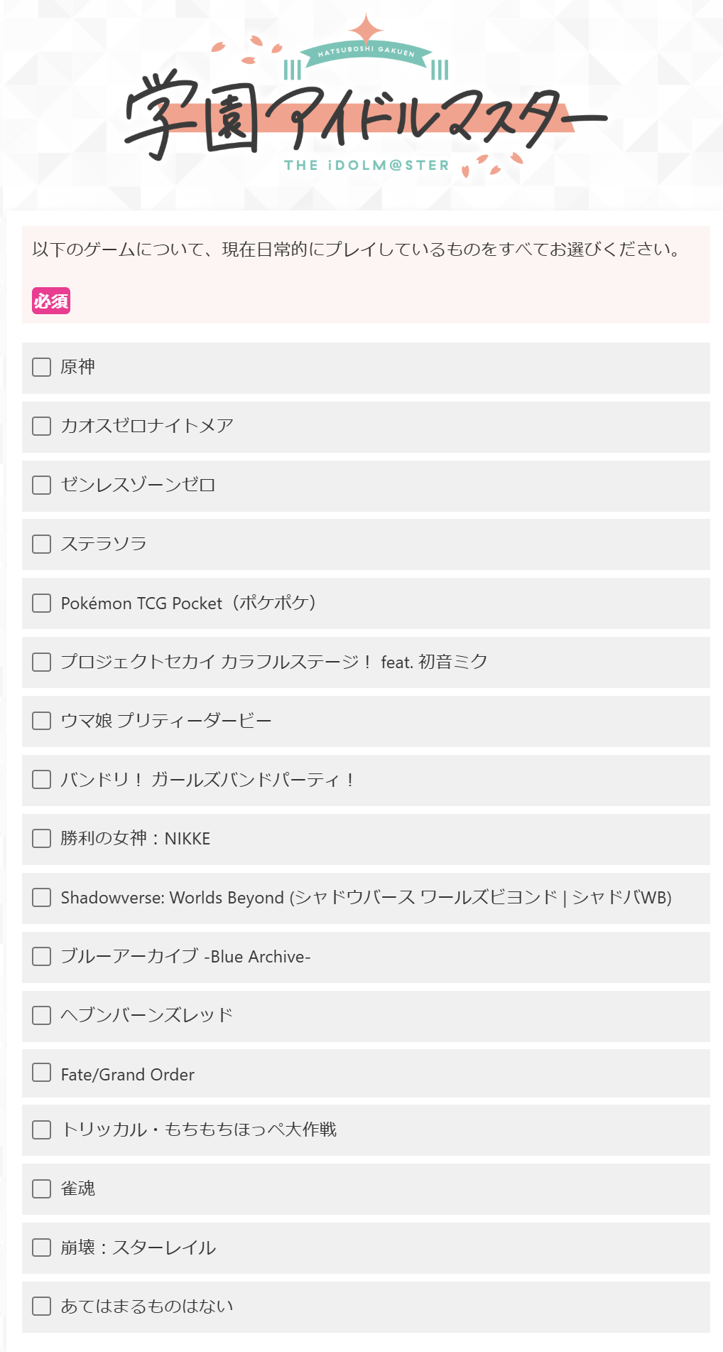 以下のゲームについて、現在日常的にプレイしているものをすべてお選びください。