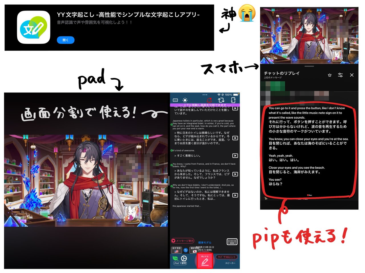 iPad、スマホなら「YY文字起こし」で2画面表示して、EN⇆JP両方、リアルタイム翻訳できて本当におすすめ